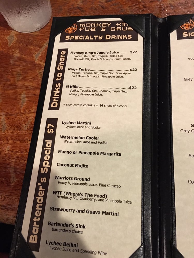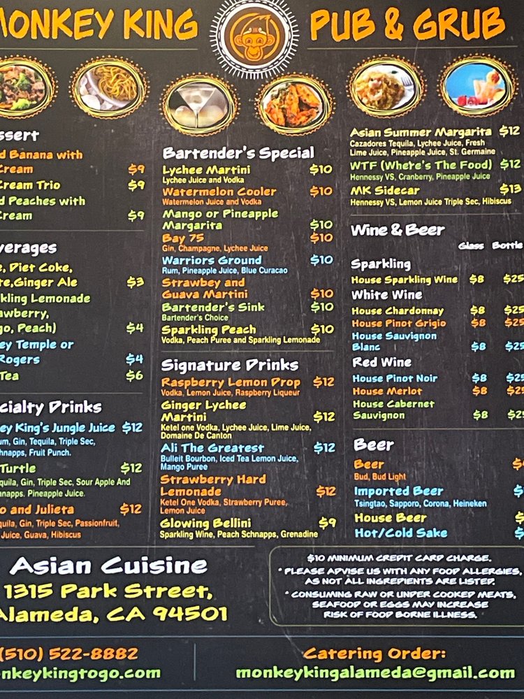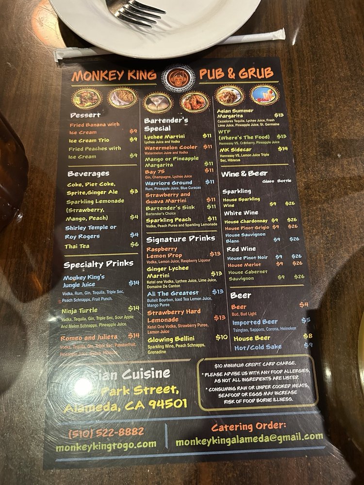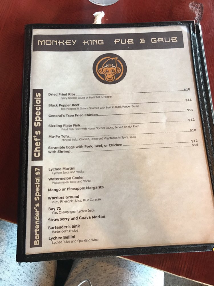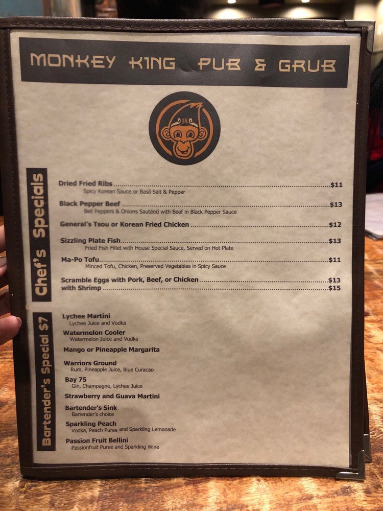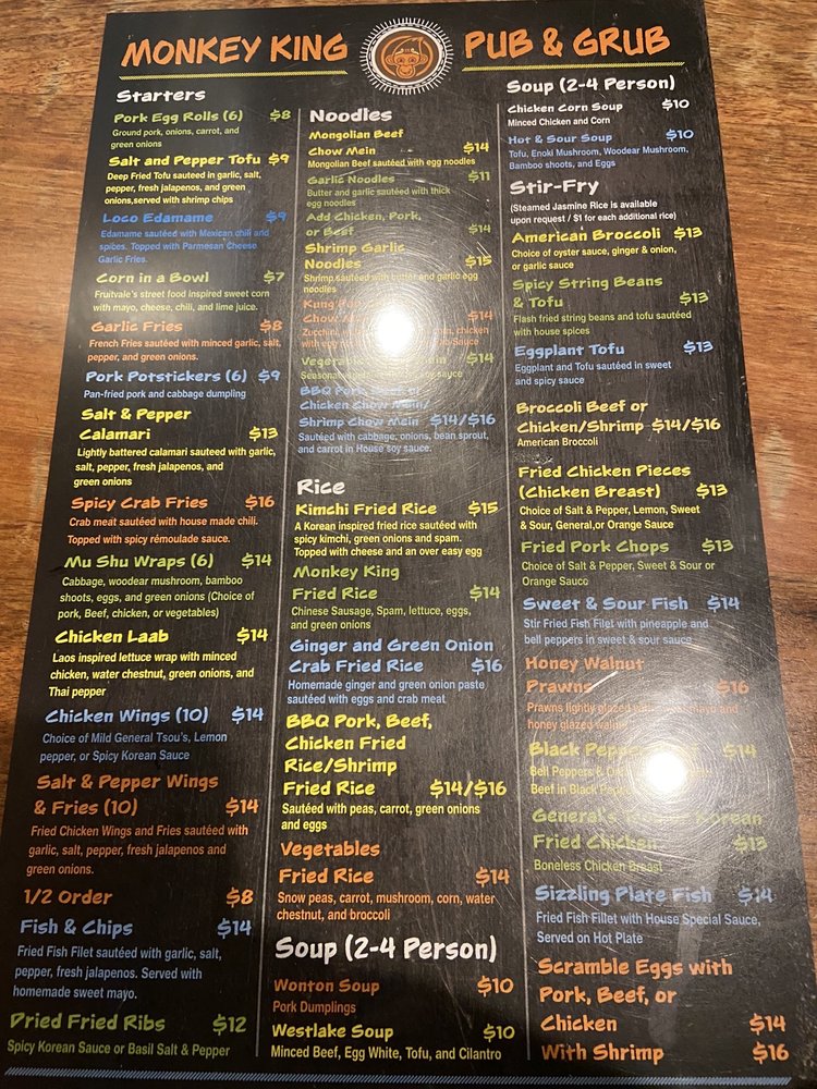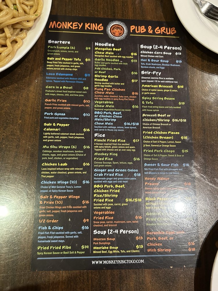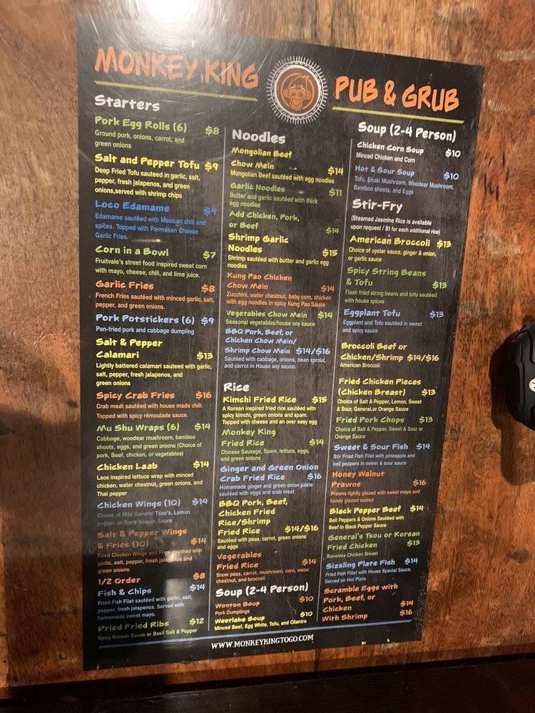 Monkey King Pub & Grub offers a variety of Asian Fusion dishes in a casual and vibrant setting. The menu features delicious starters like Salt & Pepper Wings, Pork Lumpia, and Loco Edamame. For soups, options include Wonton Soup and Hot & Sour Soup. Stir-fry offerings range from Honey Walnut Prawns to Fried Pork Chops. Notable customer favorites include the Dry Fried Ribs and Crab Fried Rice. The flavorful Garlic Crab Fried Rice stands out, along with the tangy and sweet Korean Style Chicken Wings. The Lemon Pepper Wings are crispy and flavorful, perfectly paired with ranch sauce. With friendly service, tasty food, and a lively atmosphere, Monkey King Pub & Grub is a must-visit spot for a satisfying dining experience.
